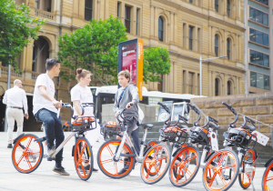 11月14日,在澳大利亚悉尼,人们试用摩拜单车。中国共享单车公司摩拜14日在澳大利亚悉尼宣布,摩拜单车正式落户悉尼。