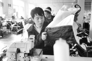 在实施精准脱贫过程中,商水县采取“企业+扶贫车间+农户”扶贫新模式,通过免费技术培训、拓宽销售渠道等多项措施,为贫困家庭、返乡农民工设立专门的就业岗位,以岗位就业促进增收脱贫。今年以来,该县已帮助近千个贫困家庭在家门口实现就业增收。图为11月16日,该县固墙镇黄台村村民在生产车间里加工订单服装。刘飞 魏红 摄