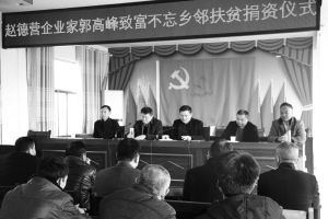 本报讯 沈丘县赵德营镇爱心企业家郭高峰致富不忘乡邻,回报家乡父老,拿出2万元爱心善款,用于精准扶贫工作。11月20日下午,县委常委、副县长王锋,县食品药品监督管理局和赵德营镇有关领导及该镇梁营村村民代表共80人参加了捐赠仪式。