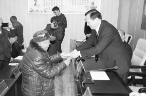 11月16日,沈丘县法院举行第九次拖欠农民工工资集中办理新闻发布会暨农民工工资集中发放仪式,发布会通报了一起拖欠农民工工资的典型案例,回答了沈丘电视台等媒体记者对畅通立案绿色通道、做好诉讼服务等热点问题的提问。图为院长赵振勇把6万余元的执行款交到农民工手中。