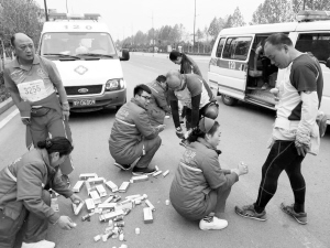 2017周口马拉松比赛于11月19日举行。市卫计委抽调26辆救护车和120名医务人员,备齐备足云南白药喷剂、速效救心丸等急救药品,为比赛提供医疗保障。图为医务人员为受伤选手喷药治疗。