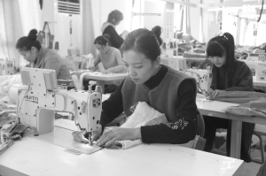 自从全县脱贫攻坚战打响之后,鹿邑县委、县政府大力实施“百企帮千户”工程,在各乡镇、村设立了169个扶贫车间(加工点)。图为穆店乡产业扶贫车间——亿森服装厂的工人正在赶制羽绒服。据了解,该厂积极吸纳贫困群众进厂就业,现有员工84人,其中贫困群众4人,每人每年可增收6000元以上。