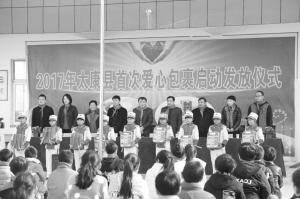 11月27日,2017年太康县首次爱心包裹发放仪式在杨庙乡军营小学举行。该县扶贫办主要领导、县教体局局长及相关领导出席发放仪式。爱心包裹项目是中国扶贫基金会联合中国邮政集团于2009年联合发起的一项全民公益活动,该项目搭建了透明、便捷的捐赠平台,旨在关爱弱势群体、推动全民公益事业、促进社会和谐。李清华 摄