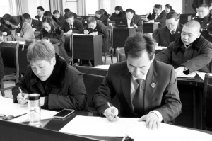 11月22日,扶沟县检察院组织开展学习党的十九大精神知识测试活动。试题紧紧围绕习近平新时代中国特色社会主义思想这一主线,涵盖了新党章、纪律处分条例、中央“八项规定”、“两学一做”学习教育等方面的内容,达到以考促学的目的。图为干警们正在认真答题。