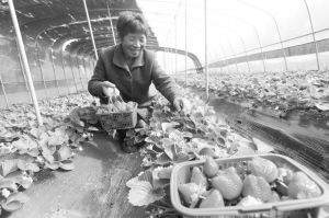 12月4日,商水县固墙镇李庄村群众在生态农业扶贫基地采摘草莓。今年以来,该县通过“扶贫基地+合作社+贫困户”的经营模式,规模化连片种植葡萄、草莓、蔬菜等高效经济作物,带动周边贫困群众走上了设施农业增收的致富路。