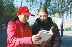 12月5日,是国际志愿者日,项城市组织全市青年志愿者开展了丰富多彩的志愿者活动,受到群众的欢迎。图为项城市中等专业学校青年志愿者走向居民小区向群众讲解十九大报告。(赵献伟 摄)