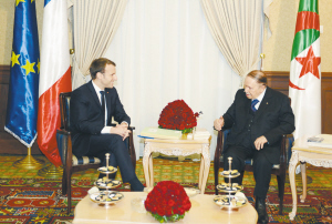 12月6日,在阿尔及利亚首都阿尔及尔,阿总统布特弗利卡(右)与法国总统马克龙会谈。