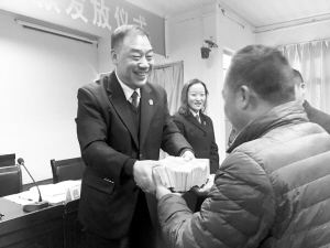 12月6日,周口市中级人民法院、扶沟县人民法院联合在扶沟举行农民工工资案件执行款发放仪式。图为周口市中级人民法院副院长温新征为农民工发放执行款。 记者 王泉林 通讯员 樊帅 摄