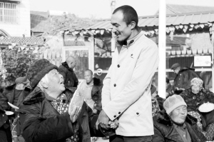 近日,在扶沟县打工的新疆维维吾尔族青年图尔洪江,带着35件棉大衣、8袋大米、5袋面粉、4桶食用油和50张馕等价值近6000元的物品,到扶沟县福安康养老院看望老人,送去维吾尔人民的关爱。图为图尔洪江和穿上新衣的老人交谈。何花 摄