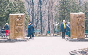12月14日,在乌克兰首都基辅市中心的基辅国立大学植物园,人们驻足观看吴为山的雕塑作品《心灵之门——塔拉斯·舍甫琴科与杜甫对话》。当日,中国美术馆馆长、著名雕塑家吴为山雕塑作品《心灵之门——塔拉斯·舍甫琴科与杜甫对话》在基辅国立大学植物园内揭幕。新华社发