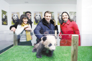 12月16日,在法国圣艾尼昂市博瓦勒野生动物园,法国总统马克龙(前中)参观大熊猫宝宝“圆梦”。