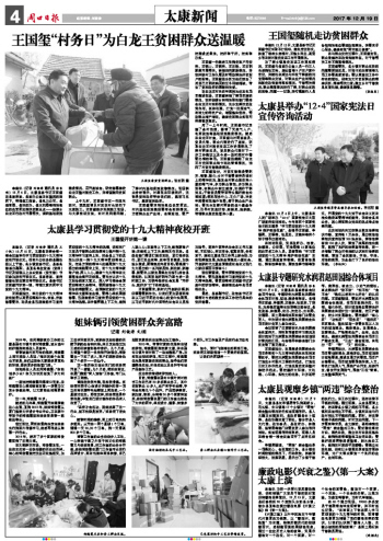 本报讯(记者 刘俊涛 通讯员 张长明)12月6日,太康县委书记王国玺在县委常委、县委办公室主任董鸿的陪同下,带领县工信委、县电力公司、县烟草局、县扶贫办、县水利局等相关单位的负责同志到扶贫联系点——独塘乡白龙王行政村开展帮扶,调研基础设施建设情况、召开座谈会、研究部署推进白龙王整村脱贫工作,并看望慰问贫困群众。