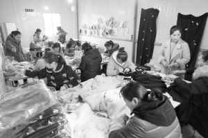 务工群众正在精心制作手工艺品。