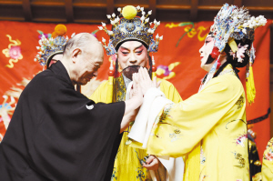 12月20日,在日本东京国立能乐堂,中国著名昆曲表演艺术家蔡正仁(中)、张静娴(右)与日本能乐界国宝级艺术大师坂井音重一同上台谢幕。