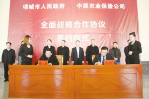 毕治军在致辞中指出,中原农业保险有限公司将以此次签约为起点,紧紧围绕项城当前的各项工作任务,以保障“三农”持续发展为己任,在“三农”发展、扶贫攻坚、民生改善、社会保障等重点领域开展合作,进一步提供多元化、多层次的保险产品和服务,共同推动现代保险市场机制的科学运用,全面提升保险的经济补偿、资金融通和社会管理功能,促进保险服务于地方经济社会良性互动,为项城市全面建成小康社会提供有力保障。