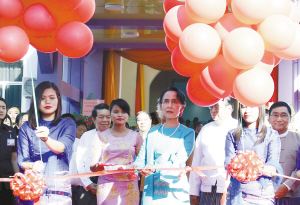 首家中缅友好医院移交启用仪式在仰光举行 12月23日,在缅甸仰光,缅甸国务资政昂山素季(右四)在移交启用仪式上剪彩。由中国驻缅甸大使馆和中国和平发展基金会出资援助改造的中缅友好医院暨杜庆芝医院移交启用仪式23日在仰光举行。 新华社发