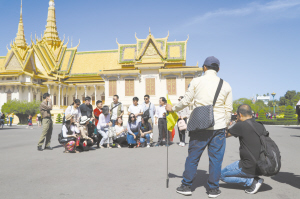 在中国和柬埔寨旅游合作发展过程中,2017年是标志性的一年。截至11月,中国赴柬游客数量首次突破100万人次大关,中国成为柬埔寨最大客源国。这是12月16日中国游客在柬埔寨金边的皇宫内游览的资料照片。新华社发