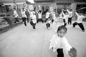 2017年12月31日,在武术之乡河北省沧州市的孟村回族自治县,孩子们练习传统武术八极拳,迎接2018年的到来。
