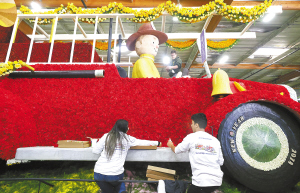 2017年12月30日,在美国洛杉矶帕萨迪纳,志愿者为花车做装饰。第129届玫瑰花车游行将于2018年1月1日在帕萨迪纳的科罗拉多大道举行。
