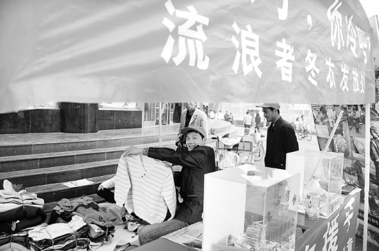“十一”长假期间,几名义工放弃休息,在市区七一路与中州路交叉口摆摊,向流浪者发放冬衣。据了解,除此之外,他们还在慈善部门的帮助下,为川汇区城南办事处赵寨村男孩赵安涛进行爱心募捐。晚报记者 朱海龙 摄