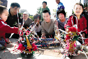 10月5日,在威海海港公园,一位老人用废弃的材料编制的工艺品“龙凤呈祥”吸引了众多市民的目光。当日,山东威海社区老人“迎重阳 展才艺”活动在海港公园举行,30多名身怀“绝技”的老人展示才艺,迎接重阳节。新华社发 于启波 摄