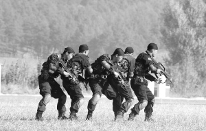 10月7日,参加演练的特战队员在黑龙江某反恐训练基地进行5人组战术演练。当日,黑龙江省公安、武警联合举行反恐实战演练,担负展演任务的武警黑龙江总队“老虎突击队”特战队员分别进行了反劫持人质、防爆技术、障碍、综合体能、射击等5个大项、17个小项的对抗演练。新华社发