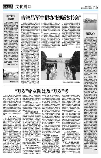 日前,周口有关部门在扶沟县崔桥镇征得一灰陶瓮。陶瓮高43.5厘米,口径31厘米,口沿高3厘米,沿厚2厘米,丰肩,敛口,直立倒锥形式样,经鉴定,属唐早期实用器物。令人惊奇的是,瓮肩部印铸有4厘米×4厘米繁体篆书“万岁”二字。据原收藏者介绍,这只陶瓮是他曾祖父遗留,迄今百余年。由于上边带有“万岁”两字,他们格外珍惜。该陶瓮为研究古文字、古文化和先民生产生活提供了实证。由此,我们也对“万岁”一词的沿革进行了研究。
