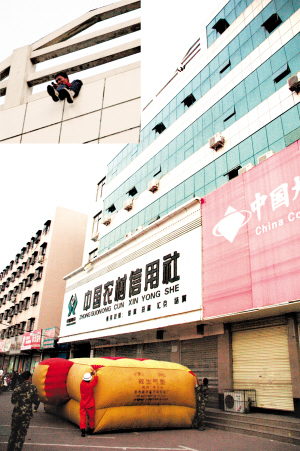 下午5时50分许,记者闻讯赶到位于周商路的某财产保险公司周口支公司楼下,只见围观群众将大楼围得密不透风,川汇区消防大队的官兵们正在加紧对救生气垫充气,市公安局沙南分局和火车站派出所的民警们正在现场维持秩序。记者仰头看到,一名30多岁、身穿红色夹克的男子坐在六楼楼顶的平台上,双腿悬空,在楼外晃来荡去,嘴里还不停地大声嚷着,情绪显得十分激动。随后,男子的家属也陆续来到现场。据其妹妹介绍,该男子姓佟,在某保险公司买了车辆保险,因其车辆出了事故,而保险公司拒绝理赔,导致其一时想不开,才要采取跳楼这种过激行为。