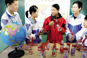 10月13日,第25次南极科考队队员田小明(中)和同学们交流。当日,即将参加第25次南极科考的夏立明和田小明来到北京西四中学,参加“触摸极地科考”科普教育活动,并接受同学们赠送的装有美好心愿的漂流瓶,准备带往南极集中投放。新华社发