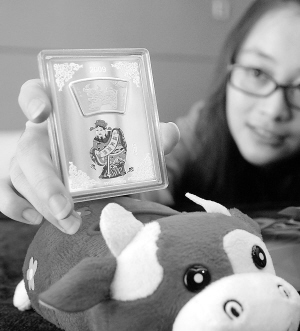 10月12日,一名工作人员展示牛年贺岁金银砖。由中国印钞造币总公司限量发行的“金牛祈福”牛年贺岁金银砖即将于10月18日在京首发。金银砖中的扇形金砖正面为生肖“牛”图案,银砖正面为“福星”图案。
