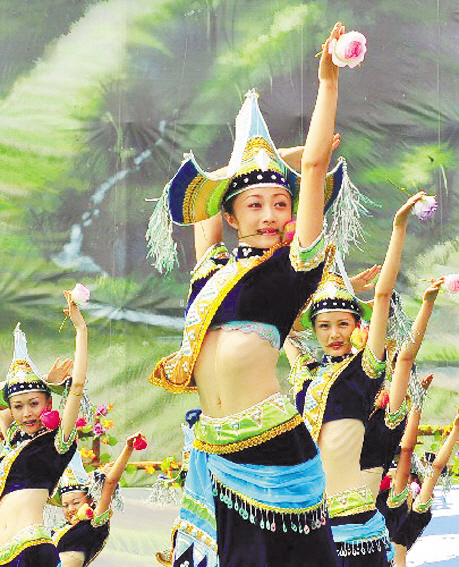 10月13日,马关县举办的首届民间艺术节开幕式上,少数民族演出大型文艺节目《艺乡欢歌》。当日,云南省文山壮族苗族自治州马关县,举办了以大型民间文艺展演、村寨原生态民俗展示等系列文化活动组成的首届民间艺术节。该县居住着汉、壮、苗等11个民族,被文化部命名为“中国民间艺术之乡”。 新华社记者 陈海宁 摄