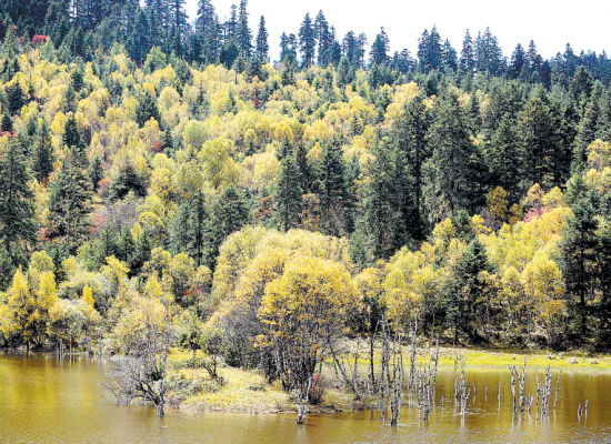 云南香格里拉普达措国家公园的秋日美景(10月13日摄)。 普达措国家公园是中国大陆第一个国家公园,总面积1313平方公里,地处云南“三江并流”世界自然遗产核心区的属都湖、尼汝片区以及国际重要湿地碧塔海自然保护区,都被划入普达措国家公园范围。公园平均海拔接近3500米,至今保持完整的原始森林生态系统、蓝天白云下的高山草甸和清如明镜的高