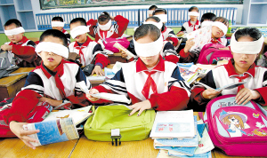 10月14日,红旗小学学生蒙着眼睛整理学习用品。10月15日是国际盲人节,山东省枣庄市红旗小学开展“做半小时‘盲人’,体验盲人生活”活动,以培养孩子们关爱盲人的意识。新华社发