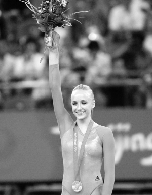 这是2008年8月15日,美国选手娜斯佳·柳金在北京奥运会女子个人全能决赛中以63.325分的成绩夺得冠军。