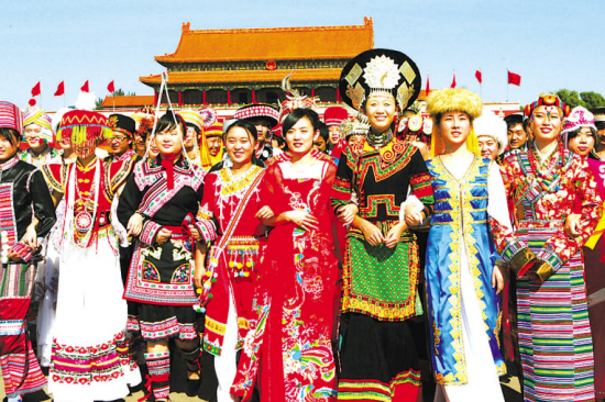 10月15日,身穿民族服饰的中学生在北京天安门广场留影。当日,112名身穿民族服饰的中学生在天安门广场亮相,这112套民族服饰为2008北京奥运会国歌合唱团所穿,即将作为藏品为大红门国际会展中心收藏。 新华社发