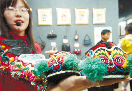 10月16日,在邢台市首届下岗女工手工艺品展上,工作人员展示由下岗女工缝制的“虎头鞋”。当日,为期3天的河北省邢台市首届下岗女工手工艺品展在邢台工人文化宫开幕。此次展览共展出绣、绘、剪、钩、雕、编等6大类的1000多件作品。新华社发