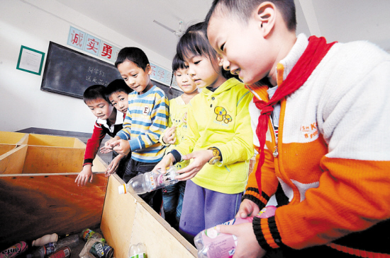 10月16日,合肥市朝霞小学的几名学生将他们收集到的旧饮料瓶放入“绿色回收银行”。合肥市朝霞小学为了增强学生的环保意识,养成保护环境的良好习惯,在学校建立了一个“绿色回收银行”,按照不同的班级分区,存储学生们平时收集来的易拉罐、铝制品、废纸等,在学期末时统一卖给回收站,所得收入成为“存款”。今年第一学期,学校将卖这些废品所得的存款全部