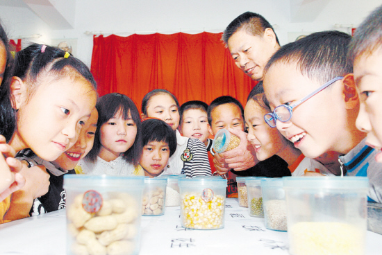 10月15日,湖北省襄樊市长虹路小学的学生们在老师的指导下认识粮食作物。当日,为迎接10月16日第28个“世界粮食日”,长虹路小学开展“粮食课堂”活动,让学生们认识粮食,懂得节约粮食的重要意义。 新华社发