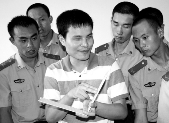 10月15日,盲人教武警战士写盲文。当日是第25个国际盲人节,厦门市残联和武警厦门支队组织80余名失明、弱视群众来到警营,亲手学着叠“豆腐块”,打行军包,真实“触摸”感受警营生活。新华社发