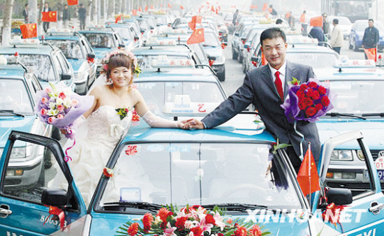 10月18日,哈尔滨新郎的哥王永辉与新娘于冉红十指相扣。当日,一场别样的“的士婚礼”在冰城哈尔滨上演。新郎冰城的哥王永辉的同事纷纷驾车赶来捧场,由88辆贴着大红喜字的出租车组成的娶亲车队,浩浩荡荡地开向新娘子于冉红家,吸引众多路人的目光。 新华社记者 梁冬 摄