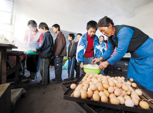 静乐县段家寨中心小学的学生正在领取鸡蛋(10月18日摄)。山西省静乐县自2006年12月起开始实施“一颗鸡蛋工程”,以改善农村寄宿制学校学生营养不良的状况。在这个国家重点扶贫开发县,农村寄宿制中小学的近4000名学生,每天都能吃上由政府免费提供的一颗新鲜鸡蛋。这一举措得到了社会的好评和专家的肯定,成我国贫困地区对儿童实施营养干预的成功范例。新华社发