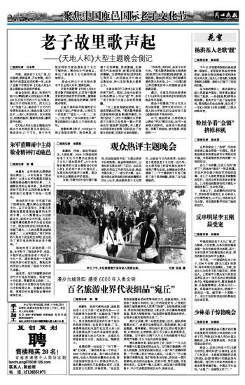 开场大型歌舞《天地人和》由著名歌手韩磊演唱,江苏青年歌舞团和武汉邮政艺术团伴舞。激情澎湃的演唱,美轮美奂的舞蹈,博得观众喝彩。