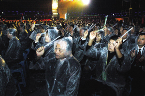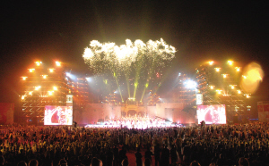 昨夜的鹿邑老子文化广场,细雨如丝,烟花璀璨,群星荟萃,万众欢腾。当夜,2008·中国鹿邑国际老子文化节开幕式暨大型主题晚会《天地人和》在这里举行,璀璨烟花不时照亮漆黑的夜空,加上明星们激情澎湃的演唱、美轮美奂的舞蹈,让来自国内外的嘉宾在老子圣像下尽享视觉盛宴的同时,通过演员们的精彩表演,领略道家文化天地人和的精义,感受道家文化的薪火相传。 晚报记者 朱海龙 摄
