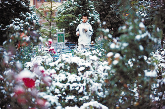10月22日凌晨,甘肃白银市会宁二中一名学生在白雪掩映的花园里晨读。当日,甘肃省定西、白银等地降下今年入秋以来的第一场雪。 新华社记者 聂建江 摄