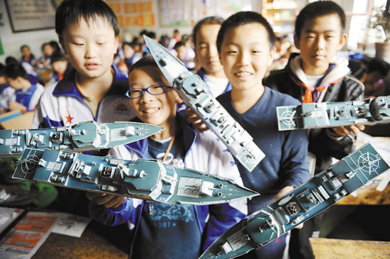 10月22日,学生们在展示他们制作的航模。 当日,兰州市安西路小学举行“自己动手,体验科学”活动,孩子们通过制作舰艇、“鸟巢”等模型,体验科学的乐趣。 新华社发