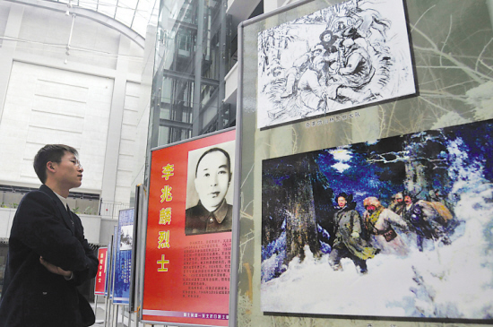 10月22日,一位学生在观看先烈事迹展。近日,哈尔滨工程大学团委和东北烈士纪念馆联合举办的以“缅怀先烈,铭记耻辱”为主题的先烈事迹巡展在哈尔滨工程大学起航活动中心阳光大厅开展,在校大学生足不出校就可以学习历史,缅怀先烈。 新华社发