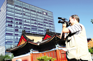 10月23日,来自俄罗斯全国电视广播公司的记者鲍里斯在北京金融街街头拍摄。亚欧首脑会议于今日正式召开,世界各地媒体的记者云集京城报道这一盛会。 新华社记者 杨光 摄