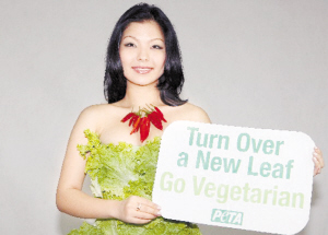 10月23日,蒙古国知名歌手克·诺明晶在乌兰巴托身着生菜叶做成的长袍为善待动物组织拍摄新一季广告,呼吁人们吃素食。这将是善待动物组织在蒙古国的首次宣传活动。 新华社记者 郝利锋 摄