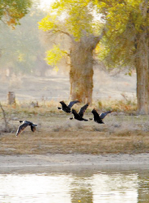 10月26日,几只水鸟从塔里木河中游两岸的胡杨林间飞过。金秋时节,新疆塔里木河中游两岸的原始胡杨林一片金黄。塔里木河中游段220公里的河流位于新疆沙雅县境内,这里水量充沛,原始胡杨林生长茂盛。近年来,沙雅县加大生态保护力度,使这里的原始胡杨林得到较好的保护。塔里木河是我国最长的内陆河,也被新疆各族群众视为“母亲河”。 新华社记者 沈桥 摄