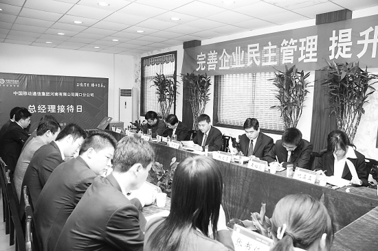 日前,周口移动公司党委书记、总经理张曙光携相关部门负责人,深入太康移动公司基层一线员工中间,开展“总经理接待日”活动,倾听员工心声,释解员工疑问,与员工共商企业发展大计。 宁宇飞 摄